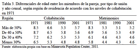 La Tabla 3 muestra la diferencia de edad entre cónyuges, esta vez clasificando a las mujeres cohabitantes y casadas en función de la entidad de residencia según el nivel de cohabitación en los años 70. En 1971 las distancias entre regiones eran mayores que en 2001. Para 1971, en el grupo de entidades con mayores niveles de cohabitación tradicional las parejas casadas o cohabitantes tenían ocho años de diferencia, mientras que en aquellas con menor cohabitación las diferencias eran de dos años menos. Para 2001 las distancias entre regiones eran inferiores a un año. Esta Tabla muestra que la diferencia de edad entre cónyuges varía en función de la región de residencia. Las diferencias de edad entre las cohabitantes siempre es mayor que entre las casadas, pero en las regiones donde la cohabitación tradicional era baja, la diferencia de edad entre cónyuges era menor para todo tipo de unión que en las de alta cohabitación. Visto desde otro ángulo, la diferencia de edad entre cónyuges de las mujeres que residen en entidades con altos niveles de cohabitación tradicional es siempre más elevada que la de las mujeres que viven en entidades con bajos niveles de cohabitación con independencia del tipo de unión.