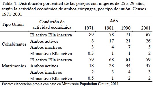 La Tabla 4 muestra la distribución de las mujeres casadas y cohabitantes de 25 a 29 años en función de la relación con la actividad económica de su cónyuge. Se pueden identificar cuatro situaciones: él activo y ella inactiva; ambos activos, ambos inactivos y él inactivo ella activa.