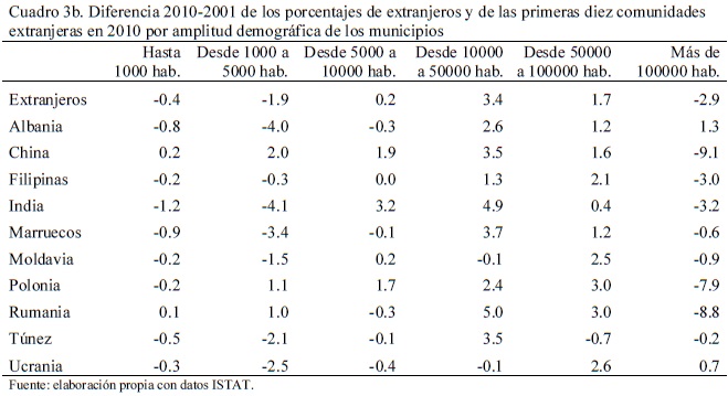 Estas dinámicas han caracterizado casi todas las comunidades examinadas, con excepción de la albanesa y ucraniana, que destacan un ligero aumento de la capacidad de atracción ejercida por los grandes municipios. De hecho, hindúes, chinos y rumanos han destacado un aumento de los residentes en los municipios de medianas dimensiones demográficas. Las dos últimas comunidades también muestran una tendencia a no despreciar, incluso, a los municipios más pequeños, mientras que últimamente parecen "escaparse" de los municipios de tamaño más grande.