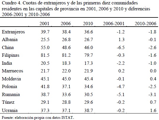 En general, parece ser que las últimas tendencias muestran una re-distribución geográfica basada en una reducción del grado de desigualdad territorial respecto a los italianos y el grado de concentración territorial.