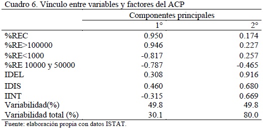 Las unidades estadísticas consideradas han sido las mismas diez comunidades de inmigrantes en 2001, 2006 y 2011 (entonces treinta unidades estadísticas). El análisis de la matriz de correlación entre las variables introducidas en el análisis muestra ya de por sí la existencia de algunos vínculos lineales particularmente fuertes, como los que existen entre el número de residentes en las capitales de provincia y el de los residentes en municipios con una población superior a los 100 mil habitantes (0.902) y entre el índice de disimilitud y el índice delta (0.800). También el número de residentes en las capitales de provincia está muy vinculado, pero en el sentido contrario, tanto con el número de los residentes en municipios muy pequeños (-0.740) como con el de los habitantes de municipios de mediana dimensión (-0.817). El uso del análisis de componentes principales (ACP) ha hecho posible extraer un pequeño número de factores, combinaciones lineales en comparación con los indicadores elementales de entrada. En concreto, se han identificado e interpretado dos factores (los únicos con un autovalor mayor de uno) que, en conjunto, explican 80 por ciento de la variabilidad total.