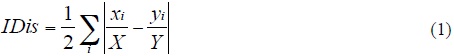 La primera medida de síntesis es el índice de disimilitud (IDIS). Originalmente conocido como nonwhite section index (Duncan y Duncan, 1955), es, sin duda, la medida más conocida de homogeneidad (evenness) y es ampliamente utilizado en muchas áreas (Wong, 1993). Este indicador es función de la distribución de cada uno de dos grupos -un grupo minoritario (X) y un grupo mayoritario (Y)- entre las diferentes zonas (i) que forman la zona de referencia (Massey y Denton, 1988):