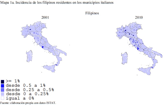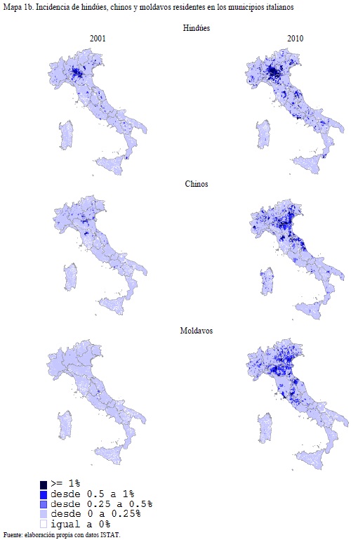 La imagen que surge es ciertamente más compleja y variada que la de 2001. Junto con el fuerte incremento del peso de cada una de las 10 comunidades en el análisis (especialmente relevante la colectividad de Europa del Este), parece evidente que los cambios ocurridos han afinado y definido de manera más clara los diferentes patrones de asentamiento, sin cambiarlos del todo. En general, las comunidades que en 2001 eran más difusas en el territorio han aumentado su nivel de difusión, mientras que las comunidades que en 2001 resultaban más concentradas en unas pocas zonas del país han mantenido esta característica, afinando más la elección del lugar donde vivir. Destacando más detalles y definiendo más las diferentes situaciones, es posible notar cómo los filipinos han fortalecido a lo largo del tiempo un patrón de asentamiento metropolitano (Mapa 1a) (las grandes ciudades de Milán, Roma, Bolonia, Florencia y Turín son las que tienen mayor presencia de los filippinos); también hindúes, chinos y moldavos empiezan y mantienen un patrón de asentamiento básicamente concentrado en unas pocas áreas, pero mientras en 2010 los primeros se concentraban especialmente en los municipios pequeños (se han asentado en los pequeños pueblos de la llanura Padana); chinos y moldavos se concentran tanto en pequeños como en grandes municipios (Mapa 1b). Los chinos, por ejemplo, residen en proporción relevante, tanto en grandes ciudades como Milán y Roma, como también en los municipios de tamaño pequeño como Campi Bisenzio.7