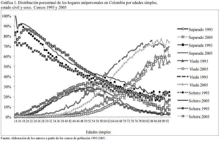 La curva de la soltería inicia en la juventud con una elevada sensibilidad, lo cual señala que el aumento en los jóvenes solteros repercute con gran amplitud en la conformación de hogares unipersonales, esto como señal de emancipación del hogar de origen. Es de anotar que la soltería constituye el estado civil primario de las personas, por lo tanto puede ser común que durante la juventud las trayectorias residenciales de los jóvenes tengan entradas y salidas del hogar de origen y por lo tanto variados arreglos domésticos que marcan la residencia unipersonal como un estado no permanente, sino en tránsito, en devenir. Después de 25 años se presenta una mínima sensibilidad, aunque positiva, ya que implica, para muchos adultos jóvenes, el abandono de la escuela, el ingreso al mundo laboral y la entrada en unión, eventos que marcan una transición al mundo de los adultos; la población entre 51 y 65 años célibe crece, pero comparativamente el impulso que le imprime a la residencia unipersonal es débil, señalando que a estas edades la opción de vivir solo es compartida con otras alternativas. Al final, en la ancianidad, se reactiva la capacidad de respuesta de los hogares unipersonales ante el incremento de la población mayor de 80 años, muy seguramente por la pérdida de los hermanos de edad corresidentes obligando una emancipación tardía y por un contingente de célibes permanentes que entre censo y censo permanecieron viviendo solos. Las valoraciones para la residencia unipersonal pueden variar a lo largo del curso de vida, asociados a la autonomía o como consecuencia producto de dinámicas familiares complejas de nuestro tiempo.