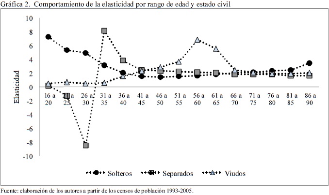 Los interrogantes previos connotan el supuesto que vivir solo es una decisión -y ciertas ocasiones una imposición- que se toma condicionada por determinado estado civil, y se respalda en razones que pueden no ser las mismas para una persona joven o adulta o para una anciana. Se diría que ante la opción de vivir solo o no, es distinto divorciarse, quedar viudo u optar por el celibato durante la juventud que en etapas más avanzadas del curso de vida. La ruta analítica propuesta en este artículo sugiere que el incremento de los hogares unipersonales conformado por personas de un estado civil, es una respuesta que se manifiesta con cierta amplitud -sensibilidad- ante la variación cuantitativa de la población en el mismo estado; complementariamente propone que tal sensibilidad no es uniforme porque está sujeta a razones diferenciadas según momentos del curso vital.