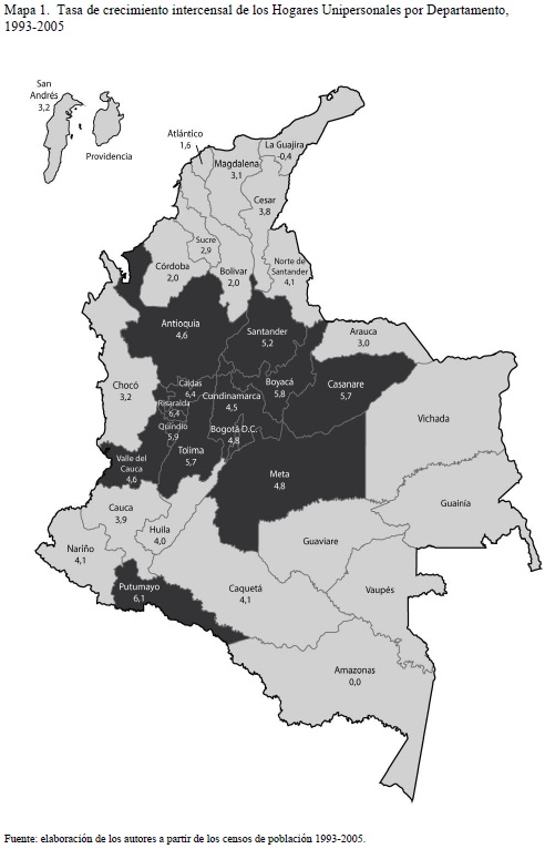 Los hogares unipersonales constituyen un fenómeno socio-demográfico de posguerra en constante crecimiento en todas las sociedades, no obstante su cada vez mayor peso relativo, el conocimiento que se tiene de esta forma de residencia es insuficiente y los factores asociados a su crecimiento han sido poco explorados. Con los datos de los censos de 1993 y 2005 para Colombia se estimaron tasas de crecimiento intercensal de los hogares unipersonales por departamentos y por edades simples, así como de las variables soltería, viudez, divorcio/separación, con este conjunto de datos se estimaron correlaciones y una medida de sensibilidad. Los estados civiles divorcios/separación y viudez presentan la mayor correlación y sensibilidad frente a la variabilidad de los hogares unipersonales en Colombia, constituyéndose en predictores para su estudio. Lo hallado para Colombia contrapone la tradición socio-demográfica que atribuye el crecimiento de los hogares unipersonales al aumento de la soltería -el individualismo-, tal situación invita a repensar los supuestos con los cuales se han teorizado y estudiado este tipo de hogares en especial para América Latina.