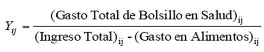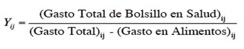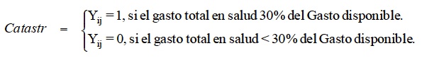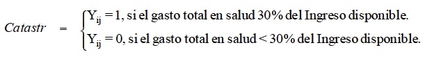 En el modelo que estima la probabilidad de incurrir en gastos catastróficos, se asume que el gasto catastrófico es un evento que ocurre cuando los desembolsos en salud, como proporción del gasto total del hogar, son mayores o igual a 0.3 (OMS, 2000). La incidencia de esta condición es agravada cuando los hogares no poseen algún tipo de seguro; lo que provoca que sean ellos los que financien las consecuencias económicas de una enfermedad y en algunas ocasiones este gasto los orille a perder parte de su patrimonio o bien que se endeuden. La ocurrencia de este evento implica para las familias o los individuos hacer sustituciones entre los distintos rubros de gasto general y el gasto en salud, lo que resulta en cambios en su patrón de consumo. Así, la probabilidad de incurrir en gasto catastrófico está en función de la condición de aseguramiento, es decir si el individuo forma parte del sistema nacional de salud, más una serie de características sociales, económicos o demográficas, propias de los hogares como son la proporción de niños y adultos mayores, pues el estado de salud de éstos es más delicado que el de otros grupos de edad; otros factores muy importantes son el acervo de riqueza o activos del hogar; la zona de residencia.