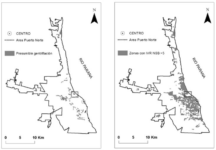 La interpretación definitiva del IVR en términos de gentrificación para cada zona dependerá, por supuesto, de lo ocurrido con el grupo en el conjunto de la ciudad. En Rosario, y dado que la cantidad de hogares NSB se redujo (Tabla 1) el valor compatible con un proceso de gentrificación será un IVR mayor que 1 (disminución de hogares NSB mayor a la media urbana).10