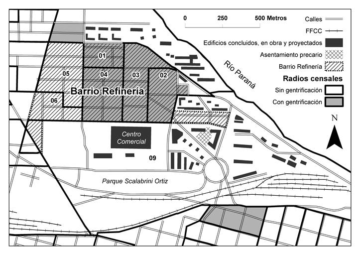La estrategia metodológica definida para estudiar la gentrificación contempla un doble abordaje cuali-cuantitativo, a partir de diversas fuentes secundarias y primarias, y distintas escalas de observación. Luego de una introducción al concepto de gentrificación y al caso de estudio, se presenta un Índice de Gentrificación de tipo estadístico especialmente diseñado para este análisis. El índice es aplicado al conjunto de las subdivisiones censales que conforman la aglomeración Gran Rosario para el periodo 2001-2010, con el fin de identificar potenciales zonas de gentrificación, determinar si existe algún patrón espacial particular y si el Barrio Refinería puede ser tipificado como un área de gentrificación de acuerdo al índice. Los resultados obtenidos a partir de este enfoque se complementan y contrastan con los que surgen de un estudio previo realizado mediante un trabajo de campo en 2008. A través de registros y observaciones recogidas en algunos casos a nivel de manzanas y de parcelas, se indagaron distintos aspectos referidos a la dinámica del mercado inmobiliario, los usos del suelo y la construcción, buscando determinar el eventual impacto de Puerto Norte y la nueva normativa urbanística que se aplicó al barrio en el marco de la gestión de este gran emprendimiento.