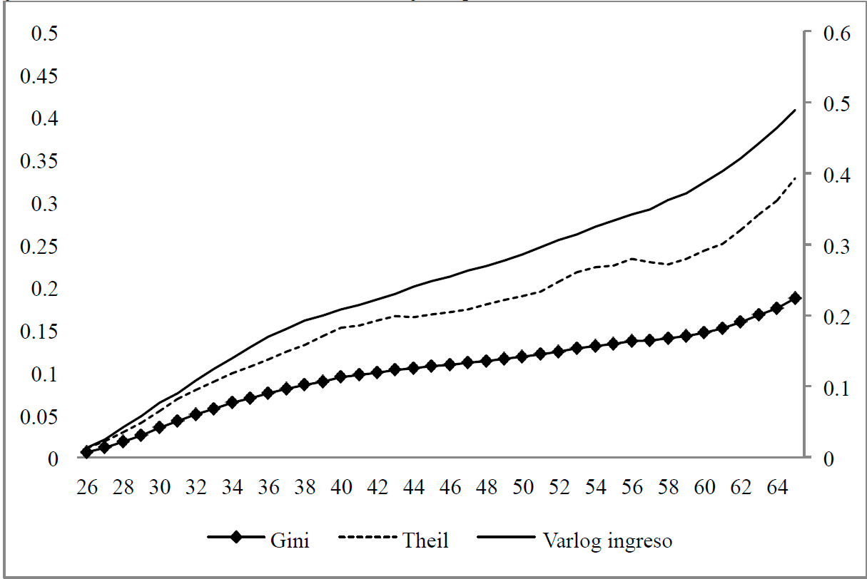 Figura 3: Efecto edad en las medidas de desigualdad. (Varianza del logaritmo del ingreso, eje derecho. Índice de Gini e índice de Theil, eje iziquierdo)