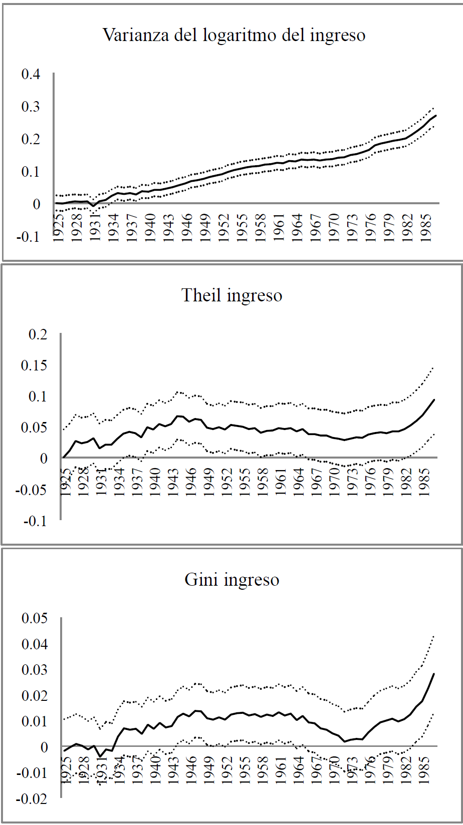 La varianza del logaritmo del ingreso es la medida de dispersión más trivial debido al extendido conocimiento y eso de esta medida estadística de dispersión. A su vez, tiene la ventaja fundamental de surgir directamente a partir de la teoría del capital humano como se mostró en el apartado anterior. Sin embargo, tiene la desventaja de que no cumple con la propiedad de Dalton-Pigou, que es una de las propiedades deseables de los indicadores de desigualdad.4 De todas formas la varianza del logaritmo del ingreso ha sido utilizada ampliamente en muchos estudios empíricos como por ejemplo Katz y Murphy (1992). Esta medida tiene la característica de ser más sensible a los cambios en la cola inferior de la distribución. Esto se debe a que al tomar la variable en logaritmos sus variaciones se asimilan a cambios porcentuales y justamente variaciones en ingresos más bajos tienen mayor magnitud que partiendo de ingresos más altos.