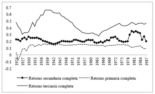 Para obtener un panorama completo es necesario estudiar la otra parte de las variables relacionadas a la educación, que son los retornos. En la Figura 7 se muestra los retornos promedio por cohorte obtenidos por completar cada grado educativo.6 El gráfico muestra trayectorias estables para los retornos a enseñanza primaria y secundaria completa para la mayoría de las generaciones, aunque mostrando cierto descenso para las generaciones más jóvenes, y un aumento y posterior caída en el retorno de completar la educación terciaria que se estabiliza a partir de las generaciones nacidas en 1960 aproximadamente y luego presenta cierta tendencia al alza. Cabe preguntarse si el aumento observado en la desigualdad para las generaciones más jóvenes no responde a esta divergencia entre los retornos de la enseñanza terciaria respecto de los retornos a completar secundaria y primaria.
