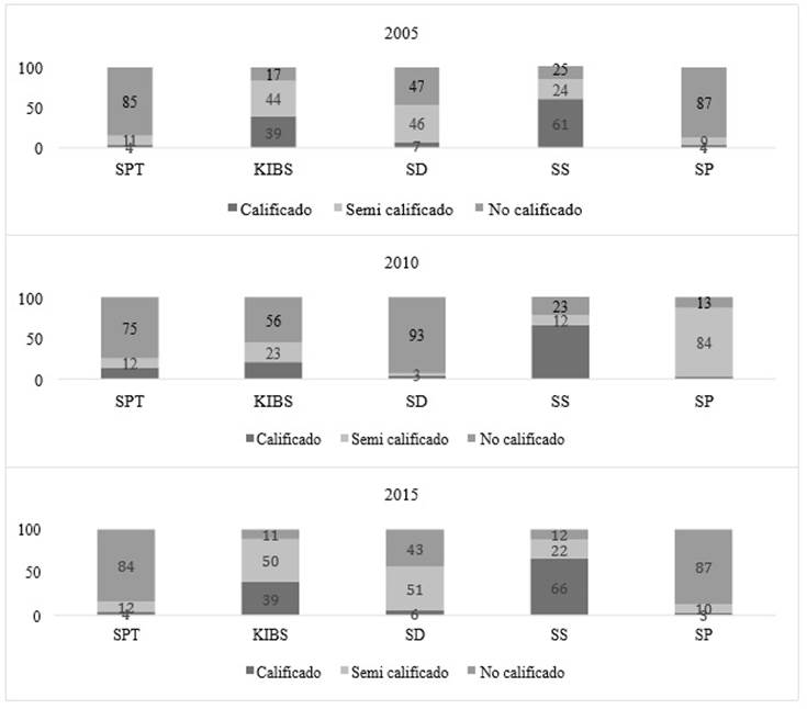 Para fines de esta investigación, la clasificación se hizo con base en la calificación laboral dividida en tres grupos: calificado, semicalificado y no calificado. Estas categorías se construyeron siguiendo una lógica de trabajo manual, administrativo y de toma de decisiones. El primero es el que requiere menos especialización en términos de funcionalidad; el segundo requiere un poco más, mientras que en el tercero se incluyen los empleos profesionales y de toma de decisiones.