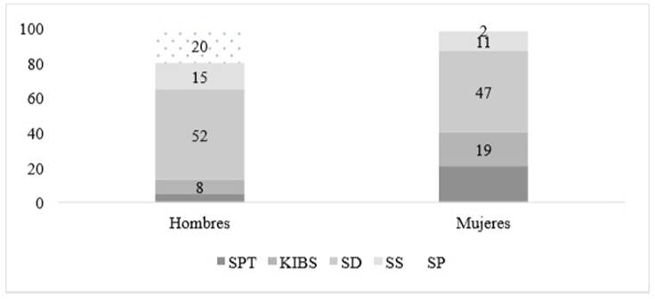 La Figura 4 muestra esta diferenciación, los porcentajes de población masculina concentrados en los STP y los KIBS son superiores al porcentaje de población femenina. El sector de STP esta vinculado a actividades de apoyo a empresas mientras que los KIBS se asocian a actividades altamente calificadas. Por su parte los SS y los SP concentran un mayor porcentaje de población femenina y ambos sectores de servicios están asociados a actividades de cuidado, servitización, educación. Ambos extremos retratan la feminización del trabajo, como cualidades intrínsecas de las sociedades que tipifican los quehaceres de los individuos de acuerdo al género.