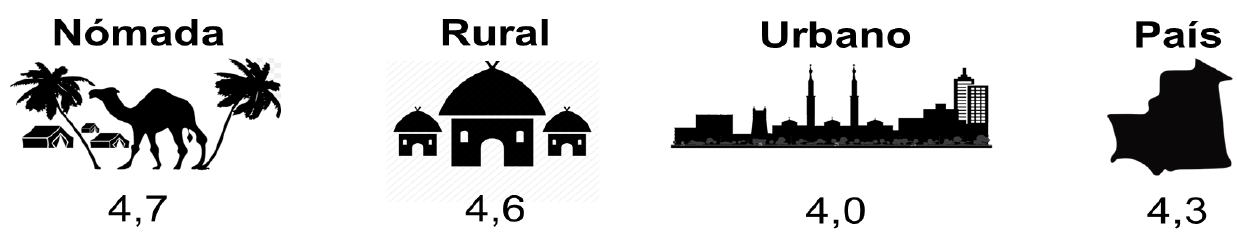 El análisis de los embarazos en adolescentes mauritanas requiere de una atención específica a los indicadores de fecundidad. En primer lugar, el índice sintético de fecundidad arroja una cifra muy elevada para el conjunto de Mauritania (4.3 hijos por mujer), al mismo tiempo que ofrece importantes diferencias atendiendo al carácter del medio, registrándose los más altos niveles en las poblaciones nómada y rural (Figura 1).