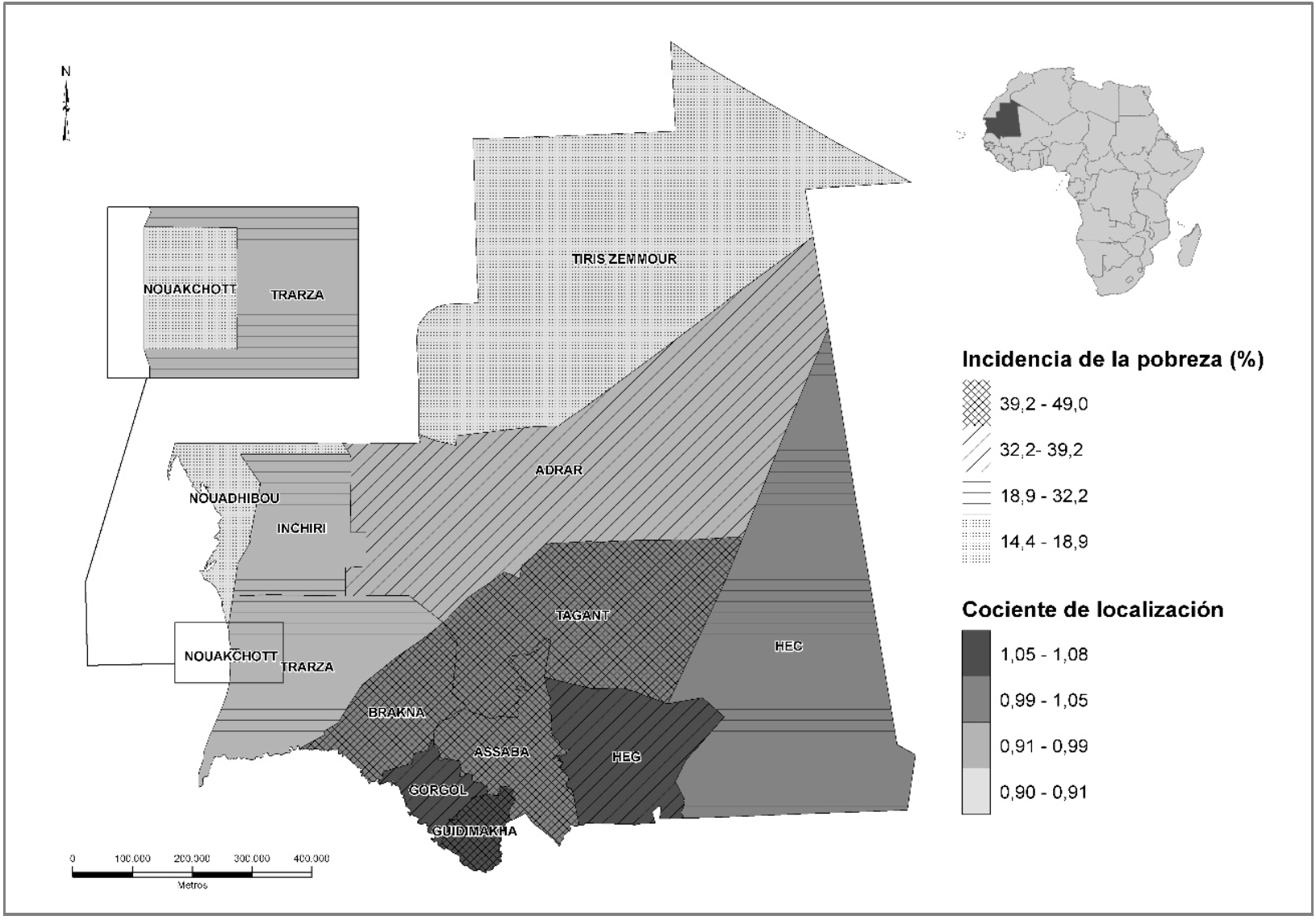 Por una parte, hay zonas muy pobladas, como las grandes ciudades de Nouadhibou y de Nouakchott, en las que se registra una menor proporción de población pobre, aunque hay localidades, especialmente en sus periferias, donde se alcanzan también unos elevados niveles de pobreza. Por otra parte, a la inversa, en wilayas muy pobladas, se registran unos niveles de ingresos muy bajos, como sucede en Hodh Echargui, Hodh El Gharbi o Guidimakha, lugares en los que la escasa disponibilidad de recursos lleva a una menor movilidad de la población, especialmente, de la femenina. Es decir, que la atracción de las zonas más ricas del país no genera una intensidad migratoria tal que suponga una disminución de población de las zonas más pobres, aquellas próximas al río Senegal y a la carretera principal que une el país en su tramo sur, de oeste a este.