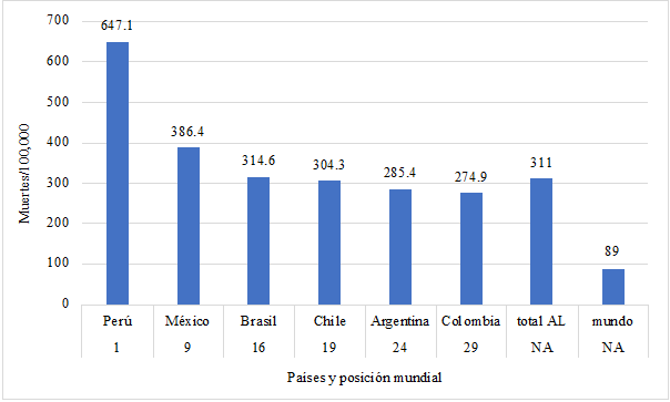 Figura 2 Países de América Latina: Muertes covid por cada 100,000 habitantes, y posición mundial por el nivel de las tasa de mortalidad por COVID 19