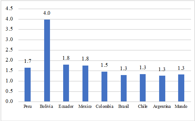 En lo que corresponde a las diferencias entre los sexos, Perú, Bolivia, Ecuador, México y Colombia presentan niveles significativamente altos de exceso de muertes entre varones si se comparan con el dato correspondiente a nivel mundial. Destaca el caso de Bolivia: ese país, además de ser el de mayor exceso de muertes entre los 40 y 59 años, también es de mayor excedente de muertes en hombres (Figura 4).