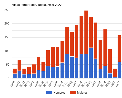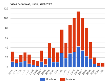 En la Figura 1 y en la Figura 2 vemos las fluctuaciones en la emisión de visas temporales y definitivas según el año. Las estadísticas confirman que la diáspora rusa es predominantemente femenina.2