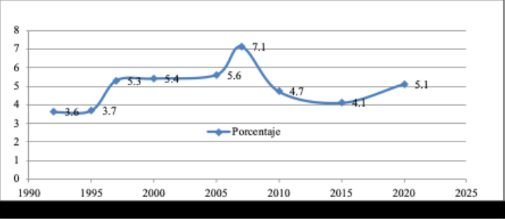 Figura 1 Porcentaje de hogares receptores de remesas en México, 1992-2020