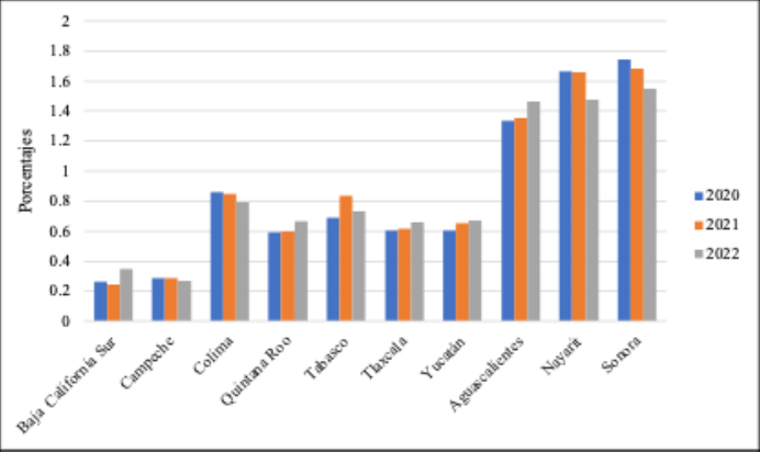 Figura 3 Entidades federativas que recibieron la menor cantidad de remesas en el país, 2022-2022