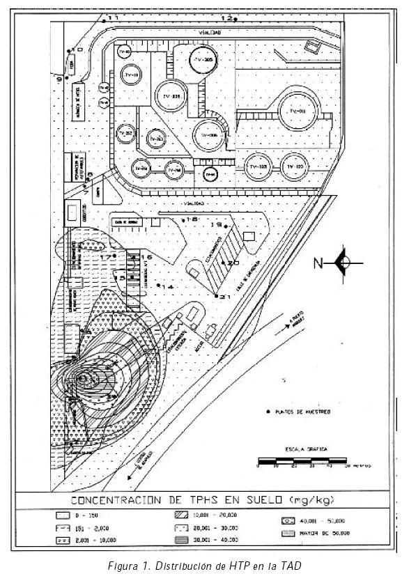 La Terminal de Almacenamiento y Distribución (TAD) está localizada al Suroeste de México. Después de una auditoría ambiental llevada a cabo en la antigua TAD, surgió la necesidad de llevar a cabo un estudio orientado a la caracterización del suelo y agua subterránea en el área de la instalación. Una de las principales deficiencias establecidas en la auditoría ambiental se refiere a la presencia de hidrocarburos al poniente de la instalación, debida a un derrame de combustible en el pasado. También se estableció la presencia de hidrocarburos cerca de la fosa de aceites, al Noreste de la TAD. De esta forma, los objetivos principales de este trabajo son: