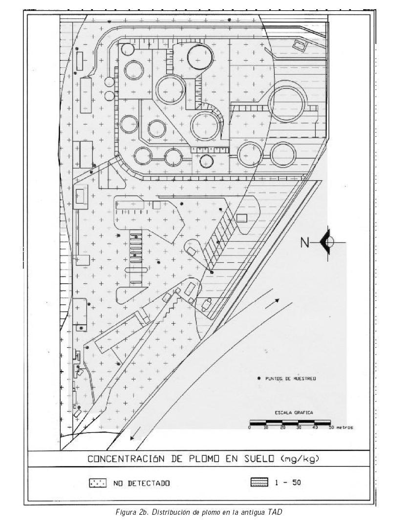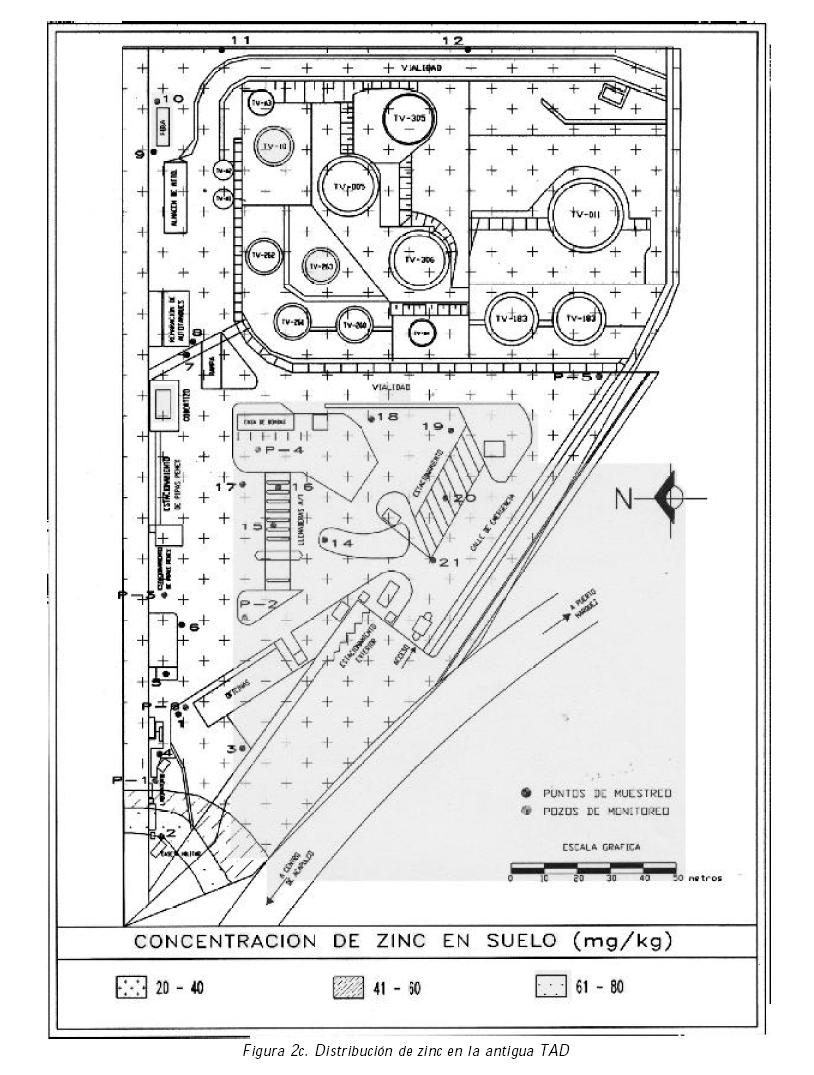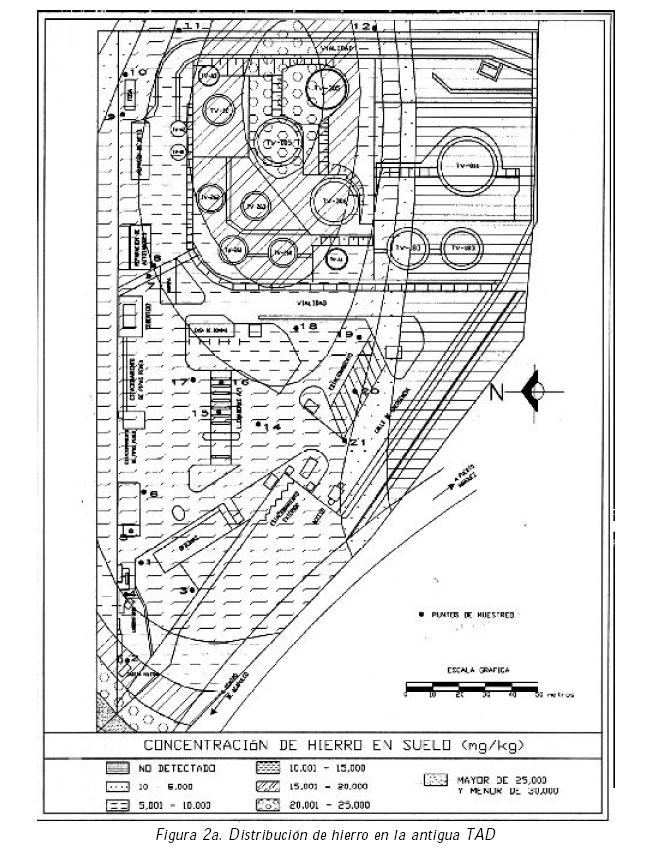 En cuanto a los niveles de metales pesados encontrados en el suelo de la TAD se puede decir lo siguiente: No se encontró cromo en ninguna de las muestras analizadas. El Fe se encontró en concentraciones de 4,885 a 20,930 mg/kg, con un promedio de 9,079+/4,000 mg/kg. El Zn fue encontrado en concentraciones de entre 18.5 y 80.7 mg/kg (con un promedio de 30.1+/13.3 mg/kg). Finalmente, el Pb se encontró en concentraciones de entre ND y 46.9 mg/kg, con un promedio de1 2.7+/12.3 mg/kg. En las figuras 2a, 2b y 2c se presenta la distribución espacial de estos tres metales pesados en los suelos de la refinería. Los valores reportados en los CIRS (PFPA, 1998) para el Zn y Pb en suelos industriales son de 1,500 y 1,500 mg/kg, respectivamente. Los valores límite reportados por Buonicore (1996) para Fe, Zn y Pb son de 25,000, 2,500 y 400 mg/kg, respectivamente. Si se comparan los datos de la TAD con los valores para Fe, Zn y Pb reportados por Buonicore, todos los valores se encuentran dentro de los límites sugeridos.