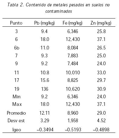 Al aplicar los promedios de los valores de concentración encontrados en la TAD (Cn) y los promedios del suelo no contaminado (Cb) se calcularon los valores de Igeo para cada metal. Como puede observarse, los valores encontrados para el plomo, hierro y zinc fueron de 0.3492, 0.5193 y 0.4894, respectivamente. Estos valores con signo negativo indican noacumulación.
