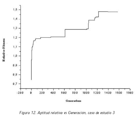Algunos de los diferentes estados evolutivos en este caso se muestran en la figura 10 y el óptimo en la figura 11. Dicho óptimo muestra un esfuerzo promedio sólo 5% mayor (300.3 kPa); sin embargo, la disminución de 42% de volumen es importante. El criterio de paro activado fue RMI EN LA GENERACIÓN 1219. La figura 12 exhibe el comportamiento de la aptitud relativa. Cada cambio de pendiente en la curva refleja la mejora en el individuo idóneo de la generación. La gran cantidad de cambios de pendiente, indican que la búsqueda realizada por el algoritmo fue amplia.
