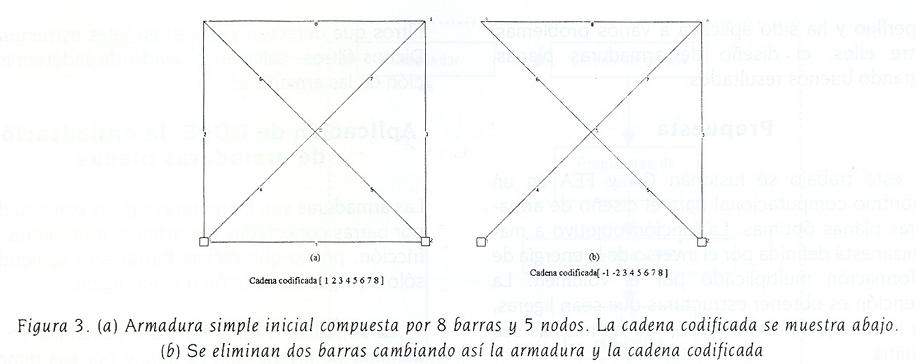 La armadura a optimizar está contenida en un dominio de diseño que se define por sus dimensiones horizontal y vertical, así como el número de divisiones en dichas direcciones. Dicho dominio de diseño, al igual que las armaduras generadas, se codifica como una cadena de números enteros positivos (el signo positivo significa la existencia de barra en la posición indicada). El algoritmo va eliminando barras del dominio para generar soluciones. Una barra eliminada se reflejará en la cadena codificada con un signo negativo en la posición eliminada (Figura 3).