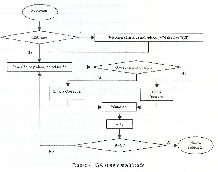 Por otra parte, para mejorar el desempeño del GA se le hicieron algunas modificaciones. El algoritmo puede ser aplicado con crossover de punto simple o doble y se incluye elitismo en la selección. La razón para realizar estas modificaciones al GA simple, es que tanto el crossover de doble punto y el elitismo favorecen el desempeño y la convergencia del mismo (De Jong, 1980).