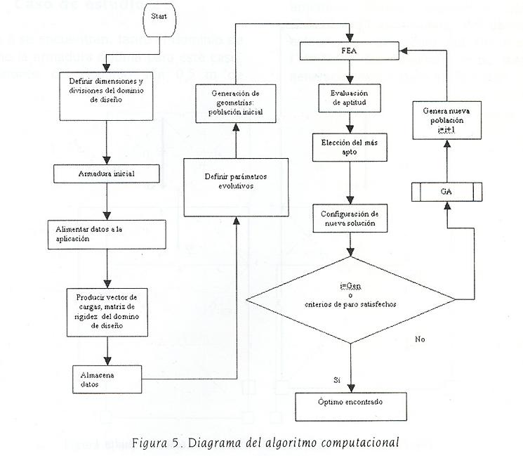 La figura 2 muestra el esquema de diseño óptimo empleando GA (DOPE). La participación del diseñador es reducida; sin embargo, es vital dado que es él quién define las especificaciones, selecciona los criterios de diseño y aplica las restricciones. El proceso de búsqueda de soluciones es desarrollado por el algoritmo que integra GA con FEA. Estructuras no rígidas pueden surgir durante el proceso, por lo que es necesario incluir filtros que detecten y desechen tales estructuras. Dichos filtros, calculan el grado de indeterminación de las armaduras.