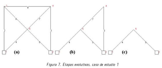 En la figura 6 se muestran algunos de los individuos de la primera población. La armadura óptima está formada por dos barras como se indica en la figura 7(c). El volumen es 79.29% menor que el del dominio de diseño. El esfuerzo promedio aumentó de 132.243 kPa a 392.837 kPa, lo cual implica un incremento del 297%.