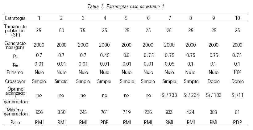 De los resultados mostrados en la tabla 1 se pueden concluir varias cosas: de las estrategias 7 y 8 el valor elevado en pc (0.75) es recomendable y el valor de pm debe oscilar necesariamente entre 0.05 y 0.1, de la 9, es clara la ventaja de crossover de doble punto sobre el de punto sencillo. Finalmente, en la estrategia 10 se demuestra la valía del elitismo para acelerar el desempeño del algoritmo.