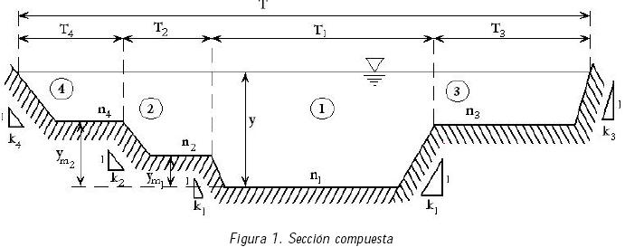 Un canal compuesto consiste de un canal principal que conduce caudales base en la parte más profunda de la sección y de canales laterales más elevados que se inundan al desbordarse el primero, para conducir en conjunto los caudales de avenidas. La figura 1 muestra una sección compuesta, donde las subsecciones laterales suelen designarse como bermas que pueden ser simétricas o asimétricas.