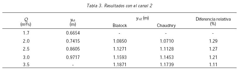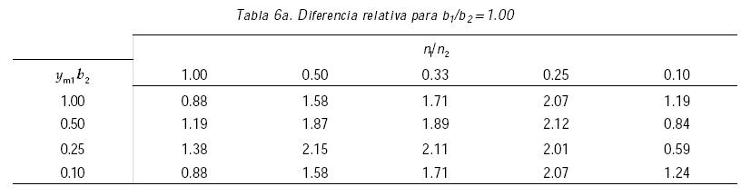 Debido a que los resultados presentados en la tabla 5 son limitados, se analizaron varios canales para determinar la influencia de las relaciones n1/n2, b1/b2 y ym1/b2. Los tirantes críticos se obtuvieron para cada sección con cinco gastos diferentes propuestos dentro de los límites superior e inferior de gastos, de acuerdo con el criterio de Chaudhry, dado que el criterio de Blalock arroja un intervalo más amplio. Se calculó el promedio de las diferencias relativas para cada canal analizado. Los resultados se presentan en las tablas 6a, b, c y d.