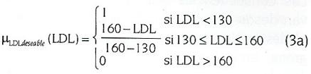 Los valores µLDLdeseable (LDL), o µIAlto riesgo (IA), por ejemplo, indican un valor de pertenencia a los conjuntos borrosos asociados a las variables lingüísticas LDL e IA, en este caso. La forma de estas funciones de pertenencia se muestra en la figura 1. Nótese que los nombres asociados a ellas sugieren lingüísticamente los conceptos médicos asociados a dichas variables.