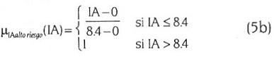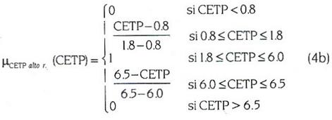 , respectivamente. Lo que se persigue es obtener la función de membresía en el consecuente, que después de haber realizado las inferencias, proporcione el máximo valor de riesgo y promedie los valores mínimo y máximo del dominio de dicha función de membresía. Este método de concresión se seleccionó, pues permite detectar para una combinación dada de valores de CT, LDL, CETP e IA, aquel consecuente que produce el máximo valor de riesgo.