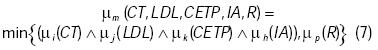 indican la operación "y" o "intersección"2 el subíndice i define a alguna de las posibles funciones de pertenencia, por ejemplo, µdeseable (CT) o µaltoriesgo(CT) en las que se ha dividido el universo de discurso de CT. En forma equivalente, los subíndices j, k, h y p se relacionan con la funciones de pertenencia en que se parten los universos de discurso de las variables LDL, CETP, IA y R, respectivamente. La expresión (7) define una implicación del tipo Mamdani (Driankov et al., 1993). Este tipo de implicación se eligió para diseñar el sistema de inferencias, pues el consecuente está dominado por el mínimo valor de todas las variables antecedentes. Esto equivale a decir que los valores pequeños de un factor, reducen la posibilidad del consecuente, independientemente del valor de los otros factores en juego. Esta forma de implicación coincide con la forma en que la comunidad médica maneja la combinación de un conjunto de signos en la formulación de un diagnóstico.