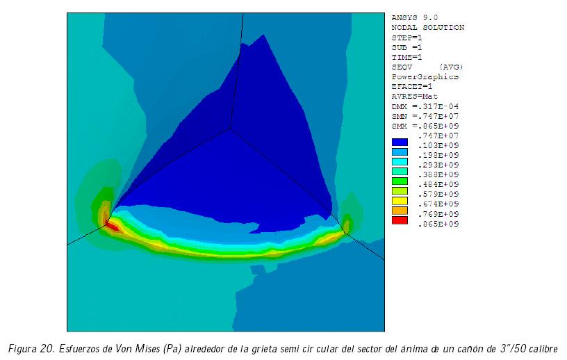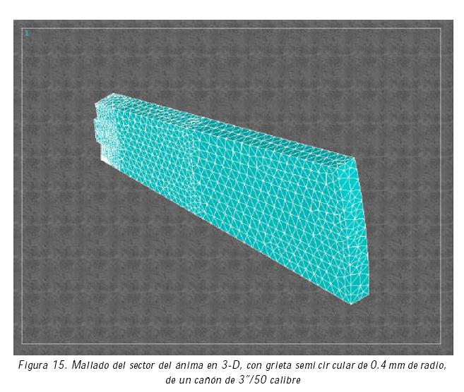 Para incluir el efecto de una grieta semicircular se realizó un modelo geométrico en 3D del sector del ánima del cañón, en donde se obtuvo un mallado muy fino alrededor de la grieta para obtener resultados confiables. Los esfuerzos máximos de Von Mises obtenidos en este modelo se concentran en la punta de la grieta, pero sin superar los esfuerzos de fluencia del material.