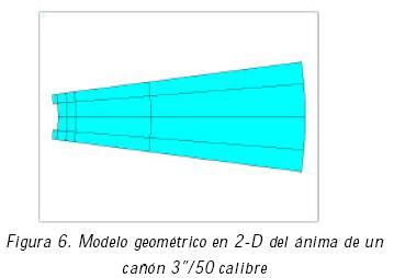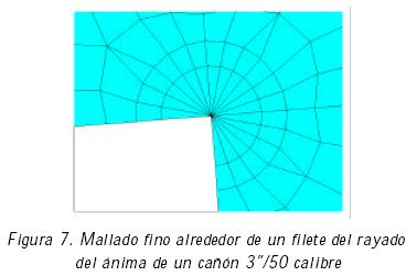 Primero se consideró el modelo geométrico en 2D de un sector del ánima del cañón (Figura 6), aprovechando la simetría del ánima y con la finalidad de optimizar el tiempo de cómputo. En este caso, se despreció el efecto de las grietas internas con la intención de conocer los esfuerzos en los filetes del rayado a una presión interna de 95MPa y posteriormente, se compararon con los resultados de un segundo caso que incluye grietas internas alrededor del filete. En ambos casos, las dimensiones en el ánima del cañón de 3''/50 calibre (medidos alrededor de la posición de la grieta interna) son las siguientes: radio interno de 7.62 cm, espesor de 5.66 cm, profundidad del rayado de 1 mm.