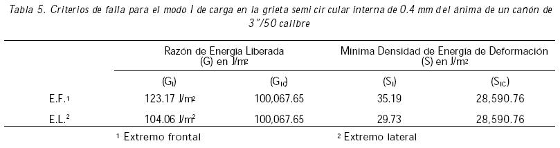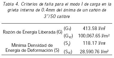 Con base a la magnitud del FIE obtenido en la grieta interna superior, se encontraron los valores de la razón de energía liberada G y la mínima densidad de energía de deformación S, así como los valores críticos para que la grieta empiece a propagarse (Tabla 4). Los resultados obtenidos indican que el ánima del cañón puede seguir operando bajo condiciones estables para esta condición de carga.