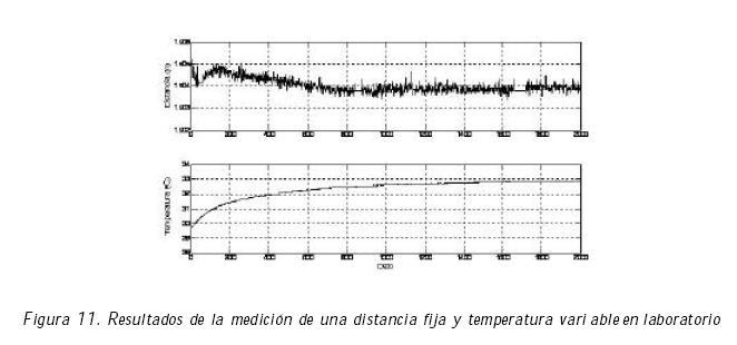 Los resultados (Figura 11) muestran la variación de la medición de la distancia con respecto a los cambios de la temperatura ambiente de 29.8 a 33°C, aproximadamente. Como se puede observar, el cambio en la distancia medida compensada en temperatura es de 0.0012 m, en un intervalo de 2000 lecturas a una frecuencia de 15 s. La distancia fija al blanco, se midió por un extensómetro de tres metros de longitud y una resolución de un milímetro, siendo ésta de 1.5 m. Para esta prueba resulta relevante la distancia fija entre el transductor y el blanco y no la exactitud, debido a que se desea medir la precisión y resolución del instrumento.