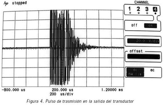 El microcontrolador genera un tren de pulsos de 40 kHz con una duración programable entre 100 y 300 µs (Figura 3), la cual es amplificada por el acondicionador de señal que consta de un amplificador operacional no inversor conectado a un transformador de acoplamiento para obtener un pulso de 160 Vpp en el transductor (Figura 4), el cual produce una onda de presión ultrasónica entre 0.0346 y 0.1039 m, a una temperatura ambiente de 300 K y de acuerdo a la duración del tren de pulsos programada.