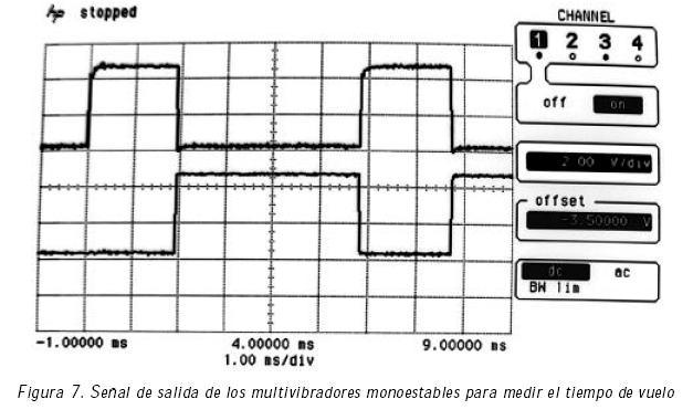 La onda de presión del pulso de trasmisión al chocar con la superficie reflejante produce un eco, que es recibido por el transductor y captada por el receptor, que también recibe el pulso de trasmisión. El voltaje del eco recibido en el transductor, depende de la distancia y de la densidad del blanco, así como de la potencia de transmisión y la sensibilidad de recepción (Figura 5). Este voltaje es amplificado a saturación por un amplificador operacional (Figura 6), cuya salida se recorta a 5 V y se conecta a dos multivibradores monoestables, el primero es disparado por el pulso de inicio de trasmisión, el cual sirve para mantener su estado inestable por un tiempo constante, lo que permite eliminar el tren de la trasmisión. Después, al caer a su estado estable se produce un flanco que dispara al segundo multivibrador a su estado inestable, el que a su vez, es llevado a su estado estable (reset) por el eco (Figura 7), de esta manera, la suma de los dos tiempos de salida de los monoestables determinan el doble del tiempo de vuelo (time of flight o TOF), entre el transductor y el blanco, en el caso mostrado, el blanco se encuentra a 5.8 ms del transductor ultrasónico.