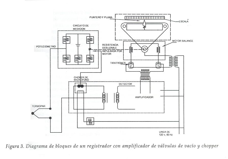 En la figura 3 puede verse que estos instrumentos usaban un circuito de medición tipo potenciométrico, en el cual el desbalance de corriente directa se convertía a corriente alterna por medio del circuito "chopper", permitiendo así su amplificación por medio de válvulas de vacío y usando el voltaje resultante para encender los tiratrones rectificadores.