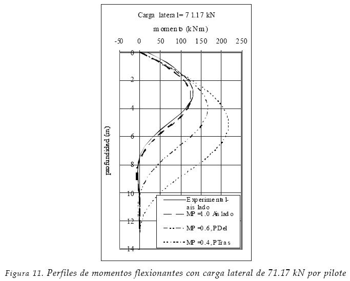 En la figura 3, se muestran los perfiles de momentos flexionantes. En general, los autores mencionados encontraron que cuando los pilotes del grupo tienen un mismo desplazamiento, y un pilote aislado tiene la misma carga promedio del grupo, los momentos flexionantes de un pilote aislado son menores que los de cualquier pilote del grupo. Los momentos flexionantes del pilote aislado son entre 30% y 50% menores que los de la fila delantera; mientras que los de las filas media y trasera son alrededor de 30% menores en los primeros metros, después alcanzan valores similares.