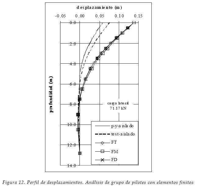 Los análisis de grupo realizados con elementos finitos TEST (se consideró al suelo elástico lineal) coinciden parcialmente con los resultados experimentales. En la figura 12 se muestra cómo el grupo de pilotes (filas traseraFT, mediaFM y delanteraFD) tienen un desplazamiento 50% mayor que el del pilote aislado, considerando que se le aplica una carga igual a la promedio del grupo, lo cual concuerda con los resultados experimentales de la figura 2.