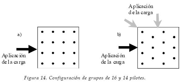 Por otra parte, para confirmar que la eficiencia de un grupo depende no sólo de la separación entre pilotes, del número y del nivel de carga alcanzado, sino también de la distribución o configuración que tengan, se hicieron dos análisis con grupos de 14 y 16 elementos con igual carga promedio pero distinta configuración dentro de una misma área, figura 14. Por los resultados antes vistos, la eficiencia de estos dos grupos debería ser muy parecida; sin embargo se encontró que la eficiencia del grupo de 14 pilotes es 79%, más alta que el 51% del grupo de 16. Como puede inferirse, para mejorar el funcionamiento de la cimentación se debe buscar la distribución más adecuada.