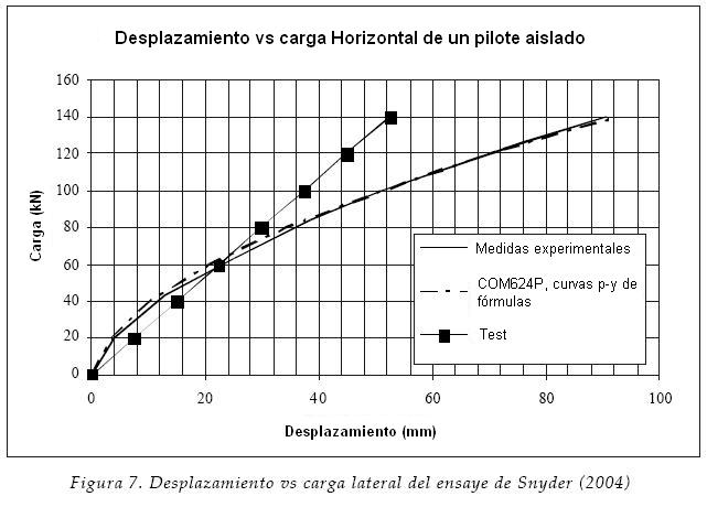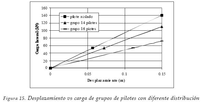Obtuvieron gráficas de desplazamiento en la cabeza vs carga lateral parecidas a la mostrada en la figura 2. La gráfica se puede interpretar considerando que todos los pilotes del grupo tienen el mismo desplazamiento y, como ya se había mencionado, se reparten la carga en forma diferenciada. Los pilotes de la fila delantera toman alrededor del 80% de la carga que tomaría un pilote aislado de las mismas características con el mismo desplazamiento; los pilotes de la fila media soportan alrededor del 50% y los de la fila trasera alrededor del 60% de dicha carga. También encontraron que algunas veces se intercambian el porcentaje de cargas las filas media y trasera, soportando la fila trasera la menor carga (Brown et al., 1987; Snyder, 2004).